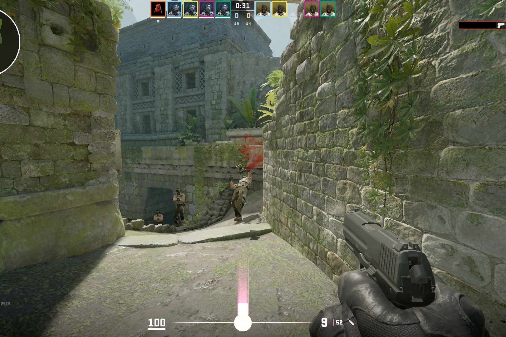 - Использование оружия дальнего боя и прострелов— еще один способ получить преимущество. На дальних дистанциях точность и урон P2000 снижаются, а его пробиваемость через препятствия оставляет желать лучшего. Поэтому лучше разменивать его через дым, ящики либо пикать с более точного оружия.